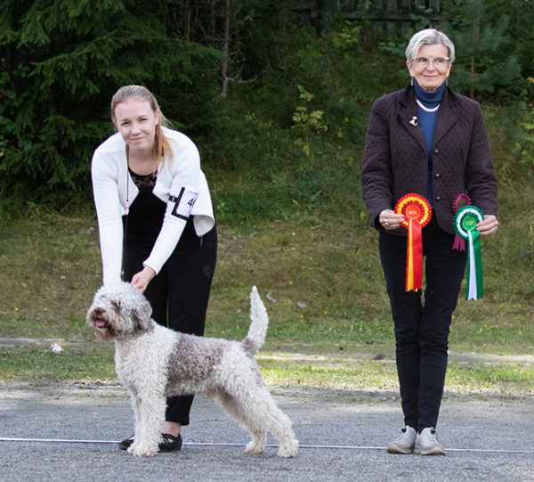 He has been shown in Norway at Norwegian Lagotto Speciality Show in May 2019, he was BM3 with R-CAC from junior class. In November 2019 he went BOS with CACIB two days in a row in Estonia.